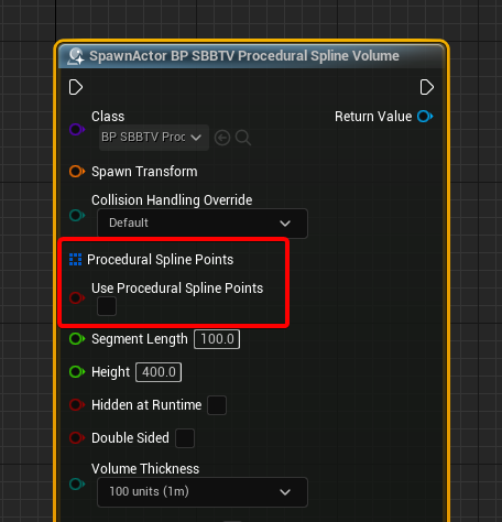 Simply provide the actor with an array of spline points, and ensure to set **Use Procedural Spline Points** to **true**, and SBBTV will create a spline volume using these points. All other exposed variables can also be set, giving you complete control over the look and behaviour of your spline volumes in this scenario.